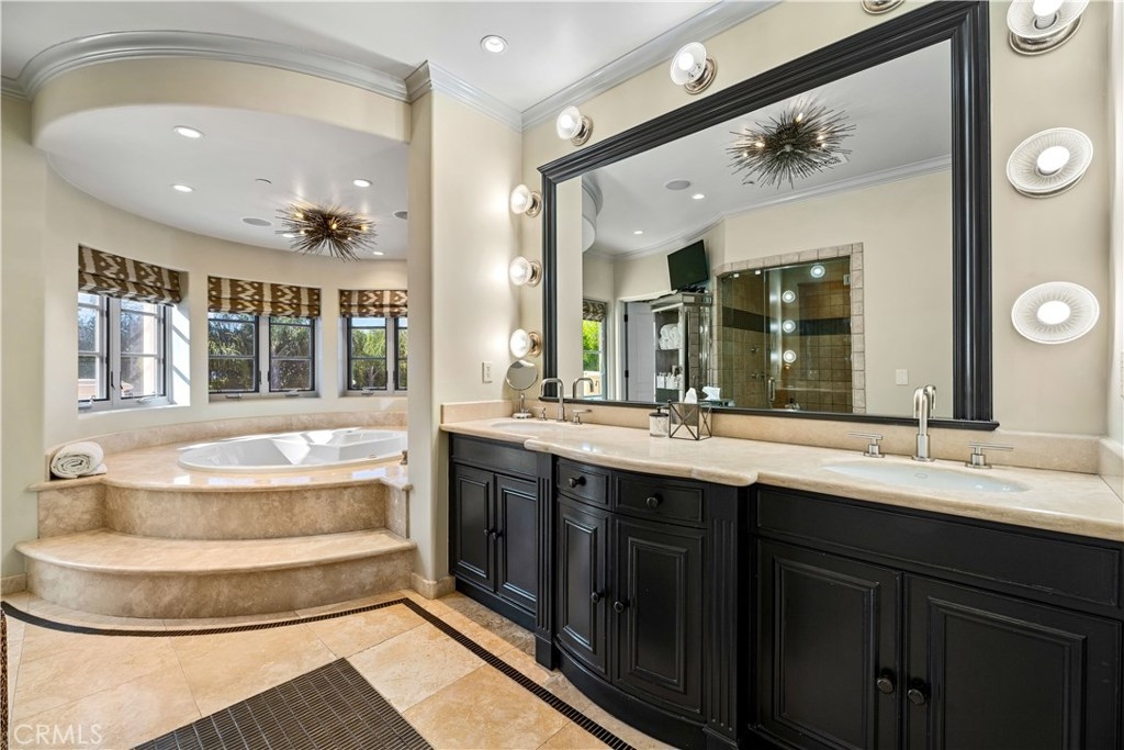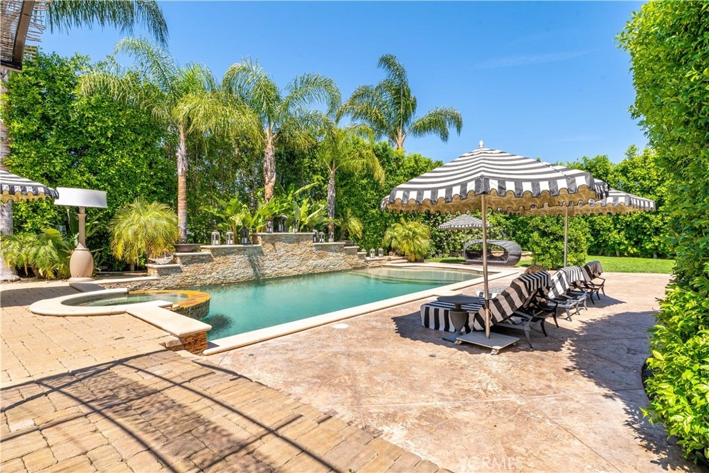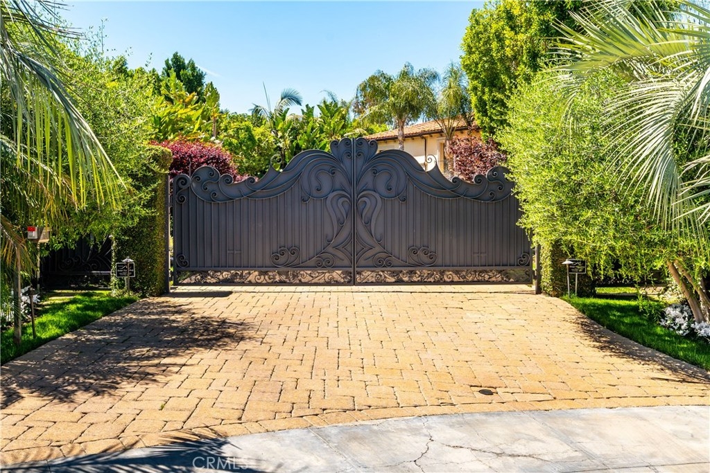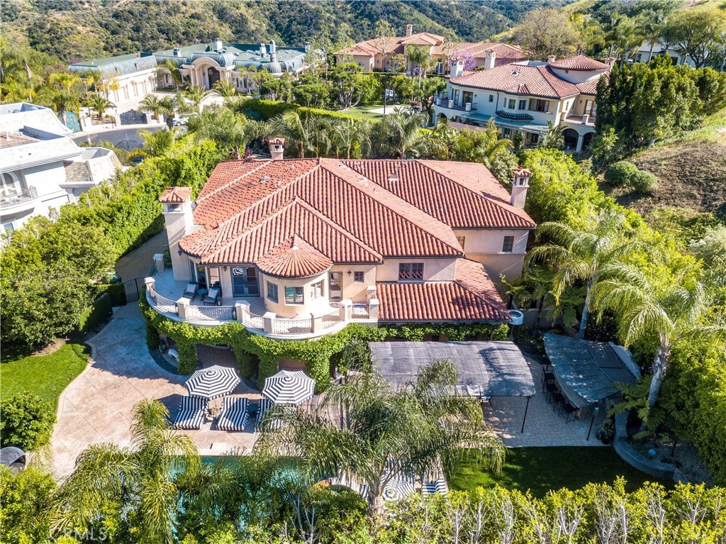 Exquisite Mediterranean Villa - Unique Prestigious Location. 1 of 8 guard gated homes; separate, private, exclusive, set away from all other Mulholland Estate homes. A private gate opens to large car court. Your entry is a dramatic 2-story foyer and sweeping staircase. Nearly 8,000 sf of lux living-6 beds and 9 baths, textured wallpaper, tumbled stone, mosaic accents++, 6 well-sized en-suite bedrooms including library/ofc that opens to lush patio + home theater, tech-bar room and dining room. All opens to expansive outdoor area. Large kitchen with top-shelf appliances, island, breakfast nook, dining bar open to large family room, fireplace with floor-to-ceiling mosaic surround. Master suite with fireplace and 3 custom walk-in closets. French doors open to view terrace. The master bath features dual sinks, spa tub, shower with customizable temp settings. Expansive resort-like grounds include sparkling pool, cascading water feature, fire pit, spa + covered arbor, outdoor kitchen and bar, other multiple seating areas abound. The entire property is surrounded by abundant lush vegetation and mature trees... truly your very private haven. Owner has done $1 million in upgrades, verification upon acceptance.